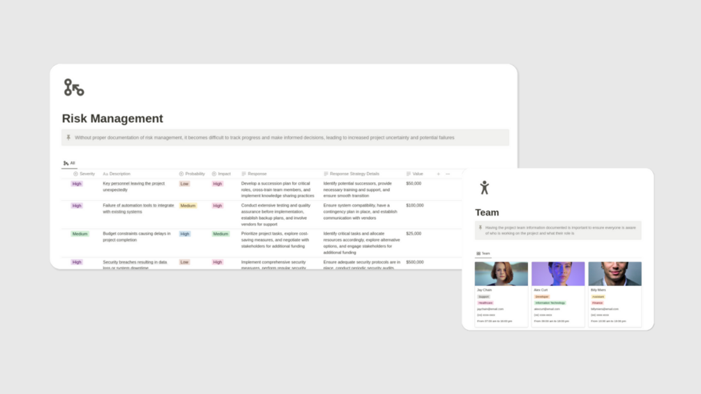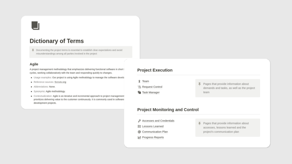 Geared towards project documentation, this template features four essential sections for excellent management: overview, planning and management, execution, and monitoring and control.